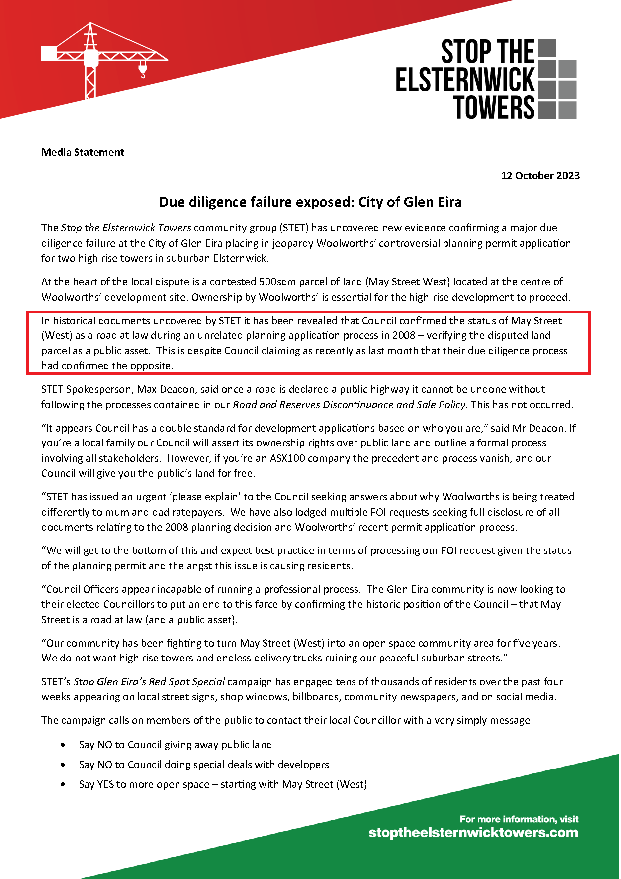 - If in 2008 legal advice found that May Street was indeed a ‘road at law’, and that council officers were informed and certainly aware of this finding, then where is corporate memory? The Woolies vcat decision goes back years and certain officers such as Torres et al were certainly working for council in 2008 and also up until recently. Surely it is part of their responsibility to have been aware of such documents – or was a blind eye turned on this ‘evidence’ because it would have made things far more difficult for Woolies?