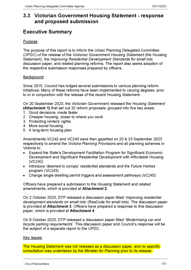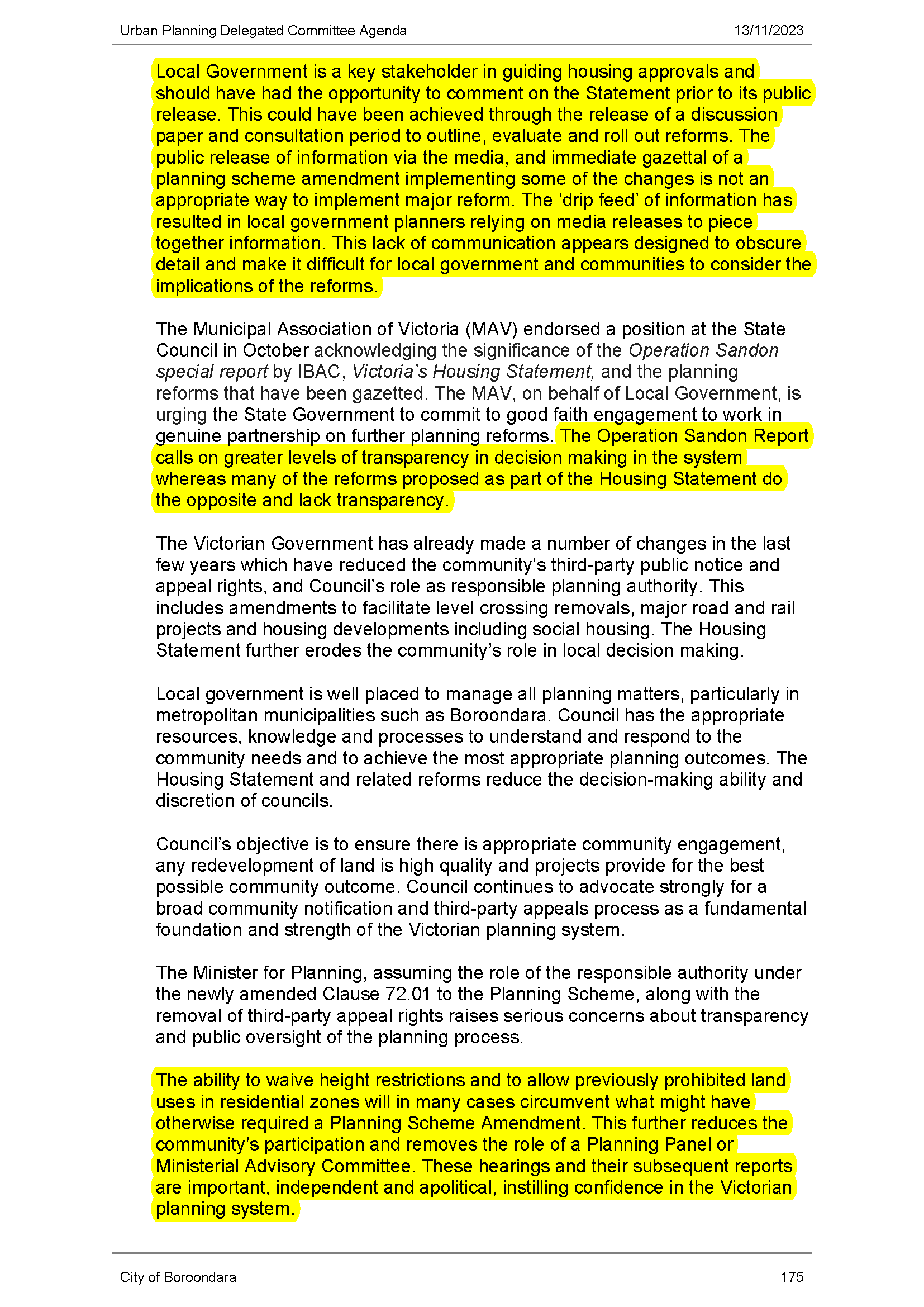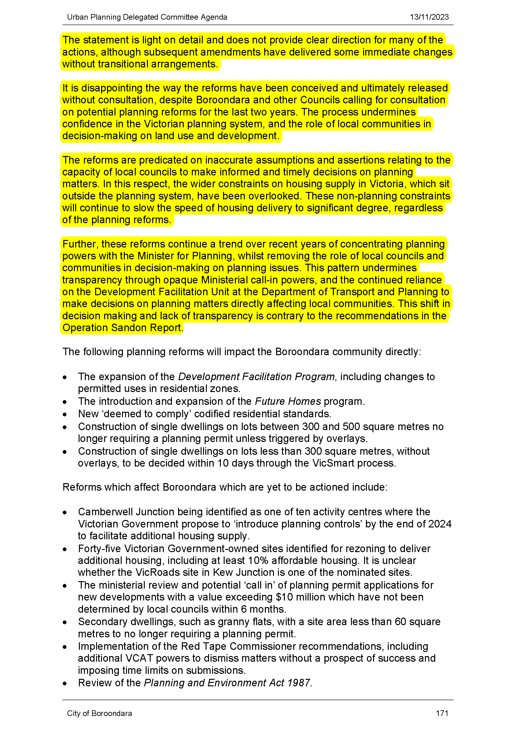 The Boroondara vote can be watched via https://www.youtube.com/watch?v=h4f_0Tab2Ag. It starts at approximately 52 minutes into the webcast. We’ve also uploaded several pages from the officer’s report. It was lengthy, but the highlighted comments here are important and reveal the primary concerns of Boroondara. Are these shared by Glen Eira? Who knows?
