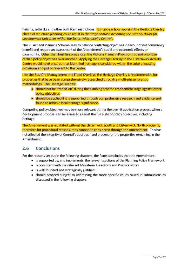 “At this stage it is not considered appropriate to apply the Heritage Overlay more extensively in Elsternwick given that Council is yet to seek authorisation for a planning scheme amendment to implement the Elsternwick Structure Plan. Doing so could, by default, lead to heritage controls becoming the primary driver for development outcomes within the Elsternwick Activity Centre.