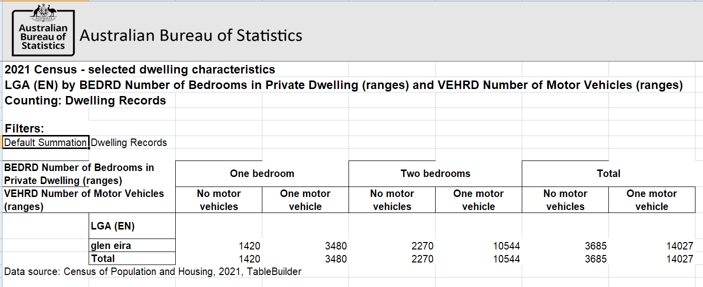 Below is a screen dump derived from the ABS which provides tallies of the number of NO CARS and ONE CAR for each dwelling of either one or two bedrooms.