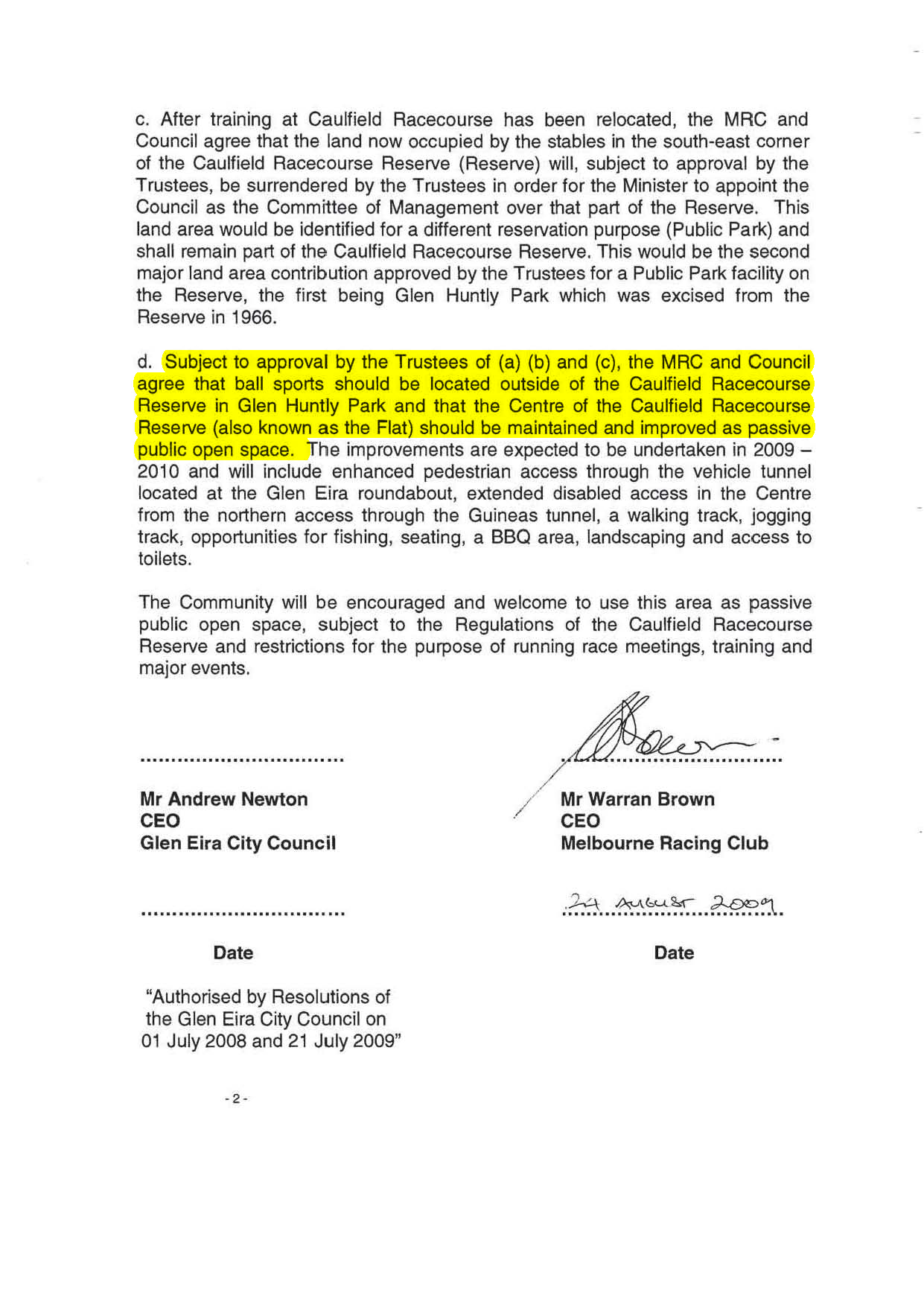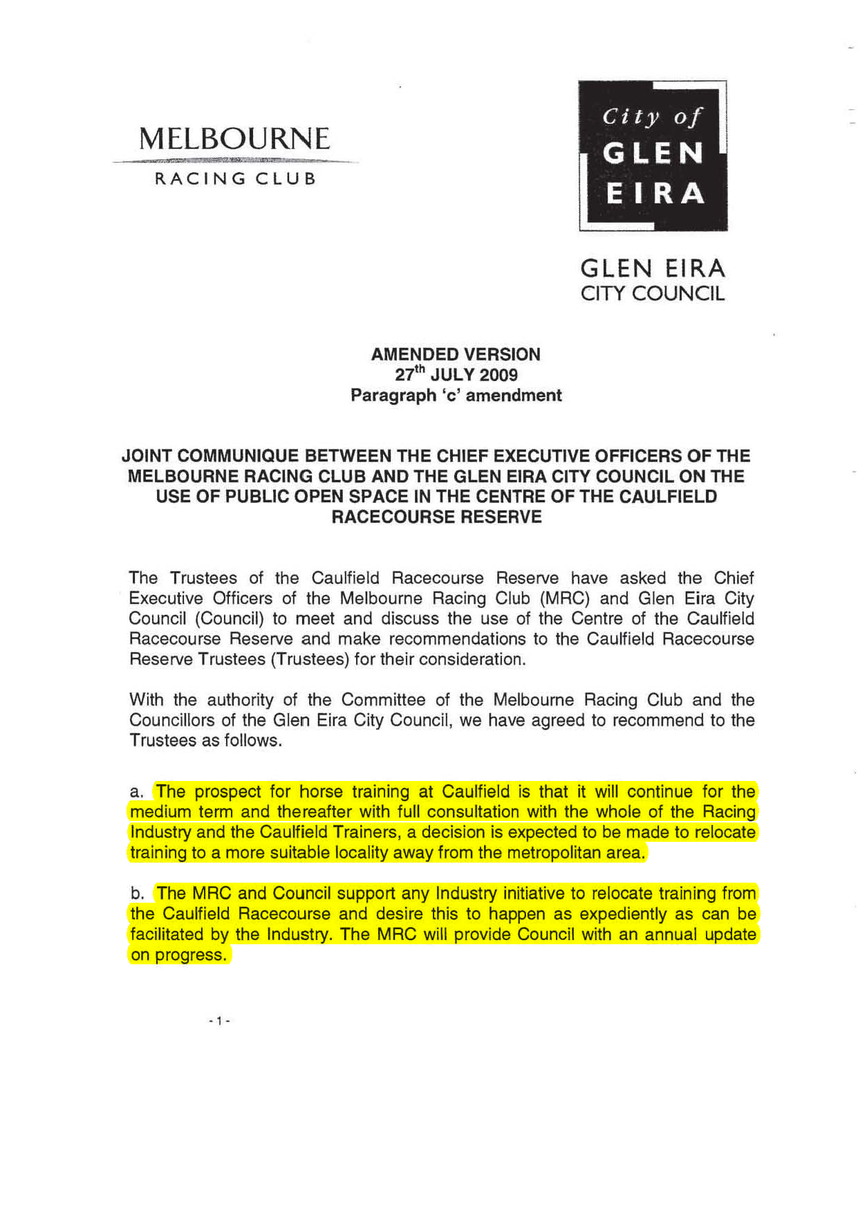 (j) That, in accordance with the April 2011 agreement, Council’s position paper on the Crown Land at the Caulfield Racecourse