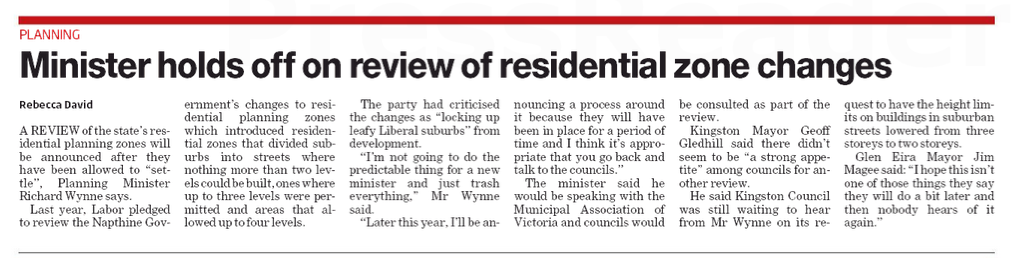 Featured below are quotes from various VCAT decisions of the past year relating to applications in ‘housing diversity’ areas. They illustrate again the shortcomings of the current planning scheme and its lack of adequate safeguards for residents in these areas.