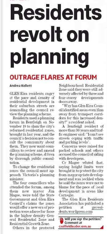 Applications for high density dwellings are going through the roof. Residents are selling up as quickly as they can – often together with their neighbours. Developers are picking the eyes out of all areas now zoned as RGZ and GRZ plus commercial and Mixed Use. And what are our councillors doing about all this? Zilch! Nothing! A big fat zero!