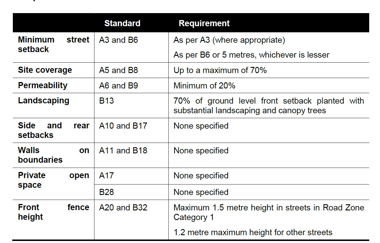 A recommended condition is included to increase the front setback by 1.5m to bring the proposal closer to full compliance with ResCode and improve the streetscape appearance of the proposal.