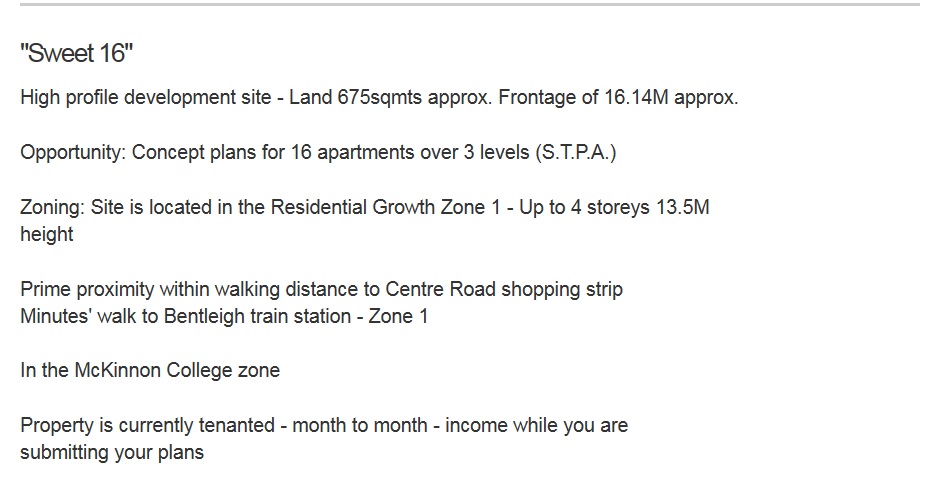 DELAHUNTY: said that councillors had discussions on this and ‘went over it in great detail’. Application is to amend earlier permit and increase dwellings from 13 to 20. The Bentleigh area is a ‘very popular place to be’. ‘It’s a wonderful place to live’ and those living there are ‘very lucky’. ‘More people want to live there’. Councillors have taken into account objectors’ views but the permit should still ‘be issued’. A 2009 VCAT hearing allowed the 13 dwellings, so there’s ‘been some history’ and subsequently the land has been subdivided and now the application wants to extend the dwellings on the rest of the site. Meets height, mass under GRZ schedule. Parking and traffic is ‘within an acceptable limit‘. Amenity also ‘complies with ResCode standards’.