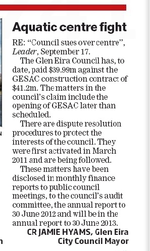 There are a number of issues concerning the building of the centre which are currently in dispute. They include the delay in completion of the centre (liquidated damages), variations, and back charges for use of Council utilities during construction and defects. The matters are the subject of civil proceedings brought by Council. A Directions Hearing on 23 August 2013 set dates for the parties to file documents. The parties are to confer and attempt to agree on a List of Issues. The parties are to hold formal mediation prior to 14 February 2014.
