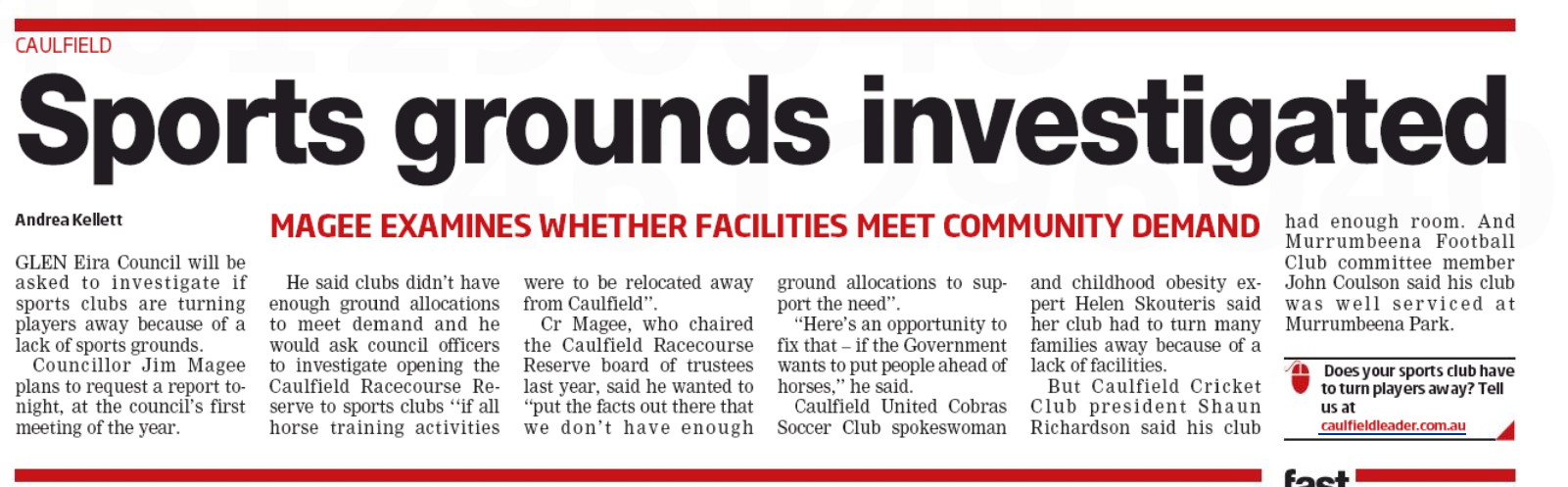 Magee’s report asked for whether in the ‘last few years’ demand has been ‘matched’ by supply for sports grounds. He also asked that included in the report be information on whether clubs have ‘exceeded their allocation’ and whether players have been turned away. Also asked for ‘advice’ on recreational ‘uses of the land’ in the ‘centre of the racecourse reserve’ if horse training was gone. He wanted this information in a ‘conceptual format’ rather than a ‘detailed format’ and that it should look at both ‘active and passive recreation’ and ‘not limited to soccer, football, netball’ and cricket. ‘all weather surfaces’ should also be looked at. This report should be ‘attained’ via external, qualified consultants. Delahunty seconded.