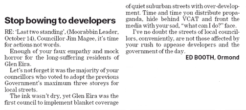 Conclusion? Whilst other councils have been busy shoring up their defences against over-development, and rejecting Planning Panel decisions and pushing ahead for Ministerial approval of their amendments, Glen Eira continues in the same old fashion – tinkering and avoiding anything that might constitute an obstacle to development.