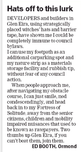 How such drivel and disdain for the public can be allowed into the public domain is beyond belief. It is arrogance of the highest order that in our view even surpasses the arrogance of the Melbourne Racing Club. In Glen Eira, residents simply don’t matter except as the permanent cash cows to keep such anonymous authors in a job!