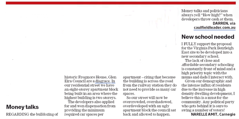 The Glen Eira City Council are a disgrace. In our residential street we have an 8 storey apartment block being built in an area where the highest building is two storeys. The crane is up and when the sun pops out you can clearly see the over-shadowing of all the houses across the street. During winter none of these poor people will get any sun. To rub salt into their wounds – the apartment developers applied for and won dispensation from providing the minimum required of car-spaces per apartment – citing that because the building is across the road from the railway station they do not need to provide as many car spaces. So our street will now be over crowded, over shadowed, over developed with an ugly apartment block the Council sat back and allowed to happen. Money talks and politicians always yell “How High?” when developers throw cash at them. This country has become a disgrace. All politicians care about is getting voted in and squeezing as much cash out of us and helping their buddies at the top end of town. When will enough be enough?