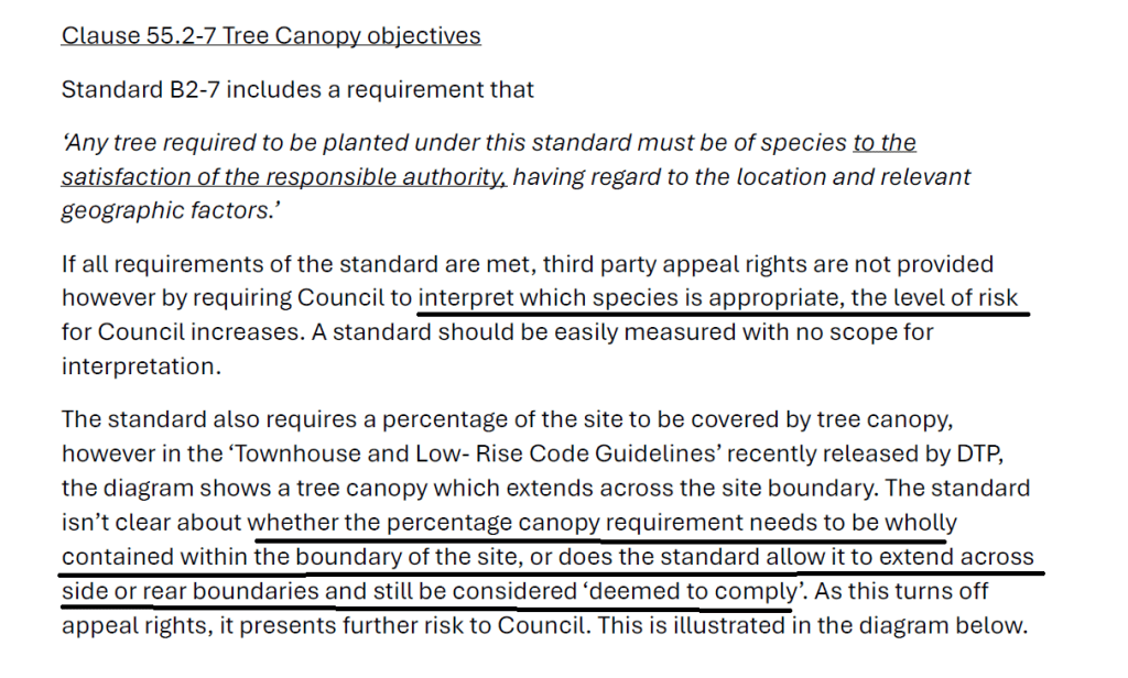 No mention is made of how this might affect tree canopy targets, nor whether the increased site coverage could simply result in larger dwellings. What’s even more amusing is the continued emphases on ‘risks’ to councils. But it has always been up to council to determine the appropriateness of landscaping. This hasn’t changed..