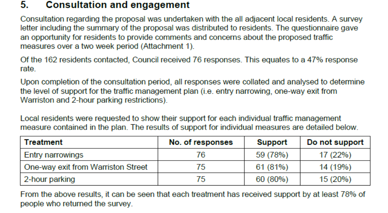 “Councillor Lipshutz, our question to you is: Did you in fact inform the traffic department of the agreement you had reached with the Rowan Street Elsternwick residents group to hold off implementation? If so when did you inform the traffic department? How many survey returns did Council receive in order to proceed with this work? What was the total cost of running the Council survey & implementing the 6 parking restrictions signs in this small section of Rowan Street?”