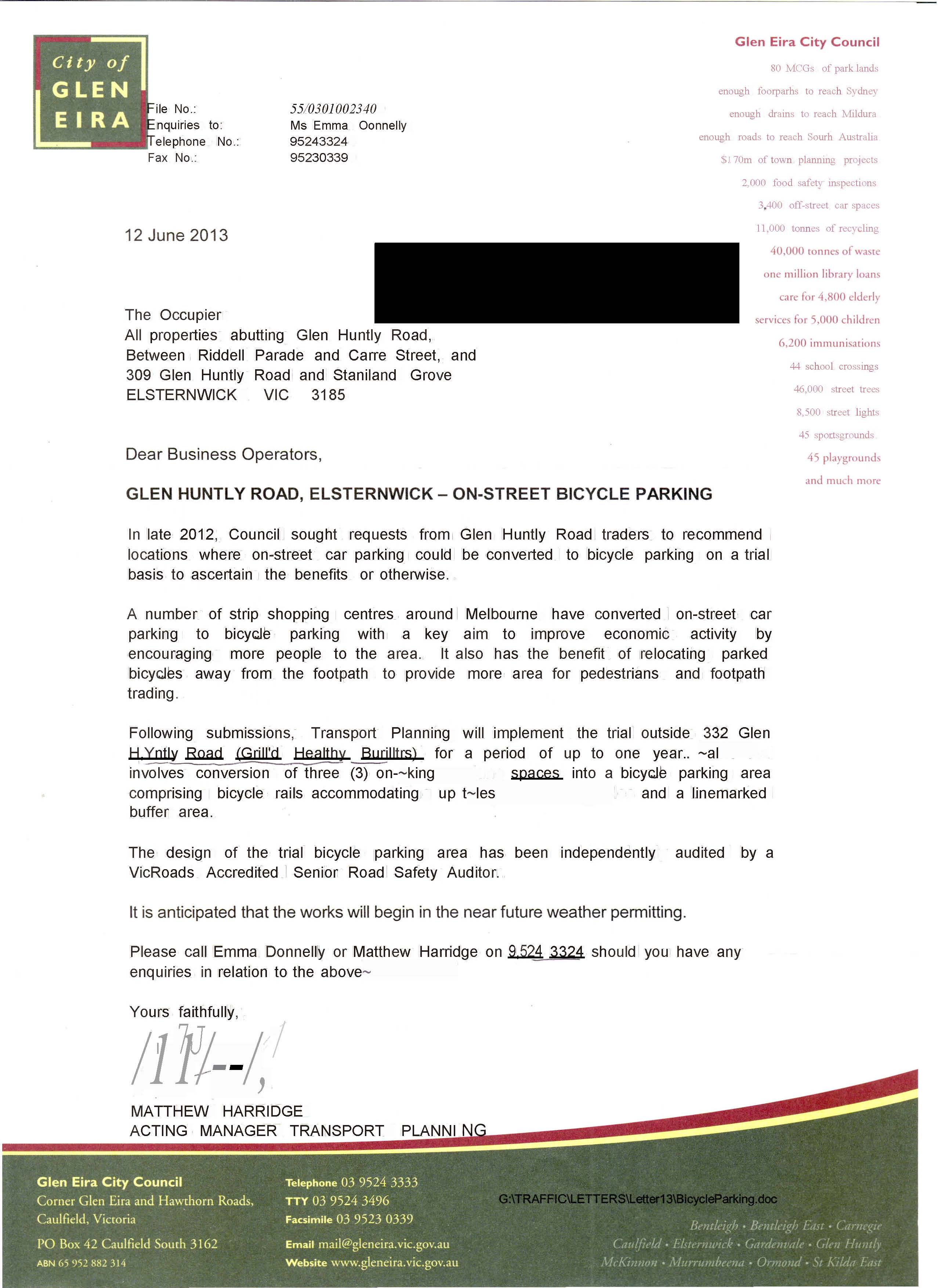 Did you in fact inform the traffic department of the agreement you had reached with the Rowan Street Elsternwick residents group to hold off implementation? If so when did you inform the traffic department?